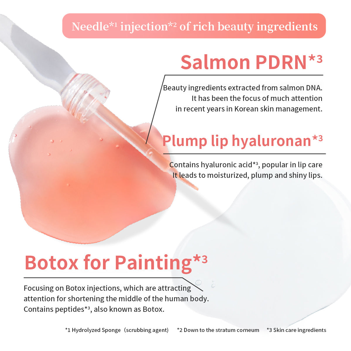 Formulated with rich lipcare ingredients such as salmon PDRN (pink peptide), hyaluronic acid, and bottox ingredients to paint