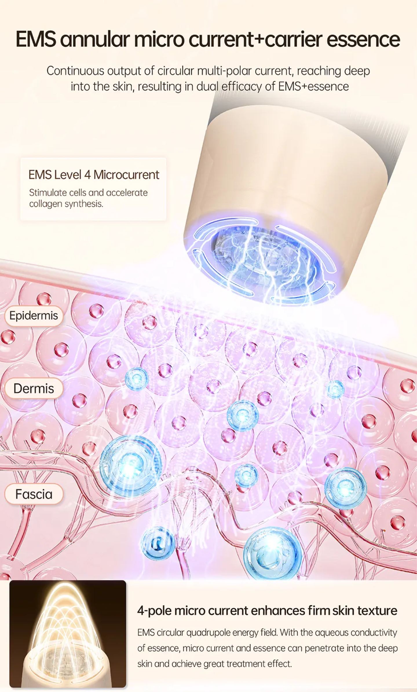 The Hydra Pen H5 4-level microcurrent EMS technology delivers continuous multipolar currents deep into the skin, promoting collagen production for enhanced skin rejuvenation.