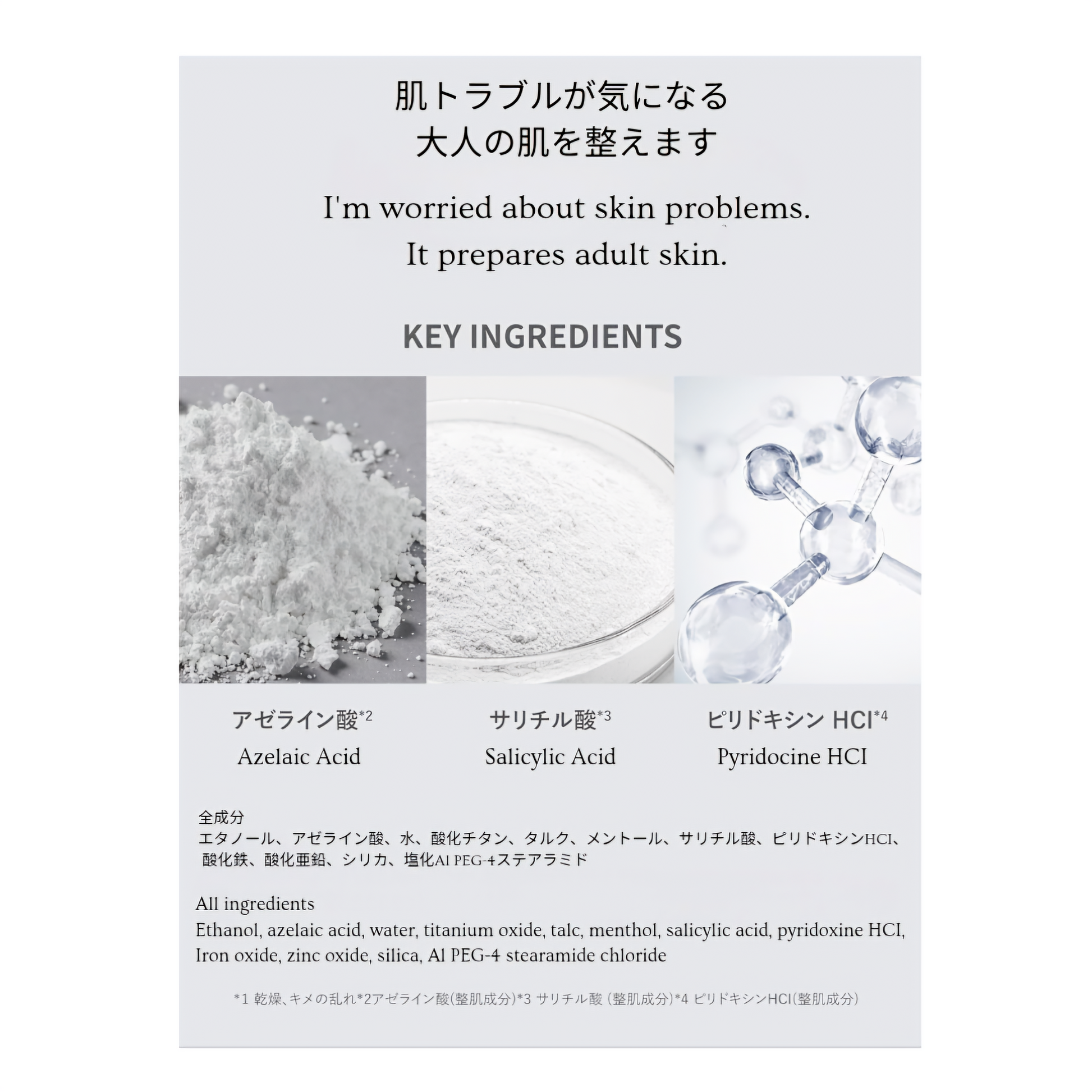 Ethanol, azeline acid, water, titanium oxide, talc, menthol, salicylic acid, pyridoxine HCI, iron oxide, zinc oxide, silica , Al-chloride, PEG-4 stearamid.