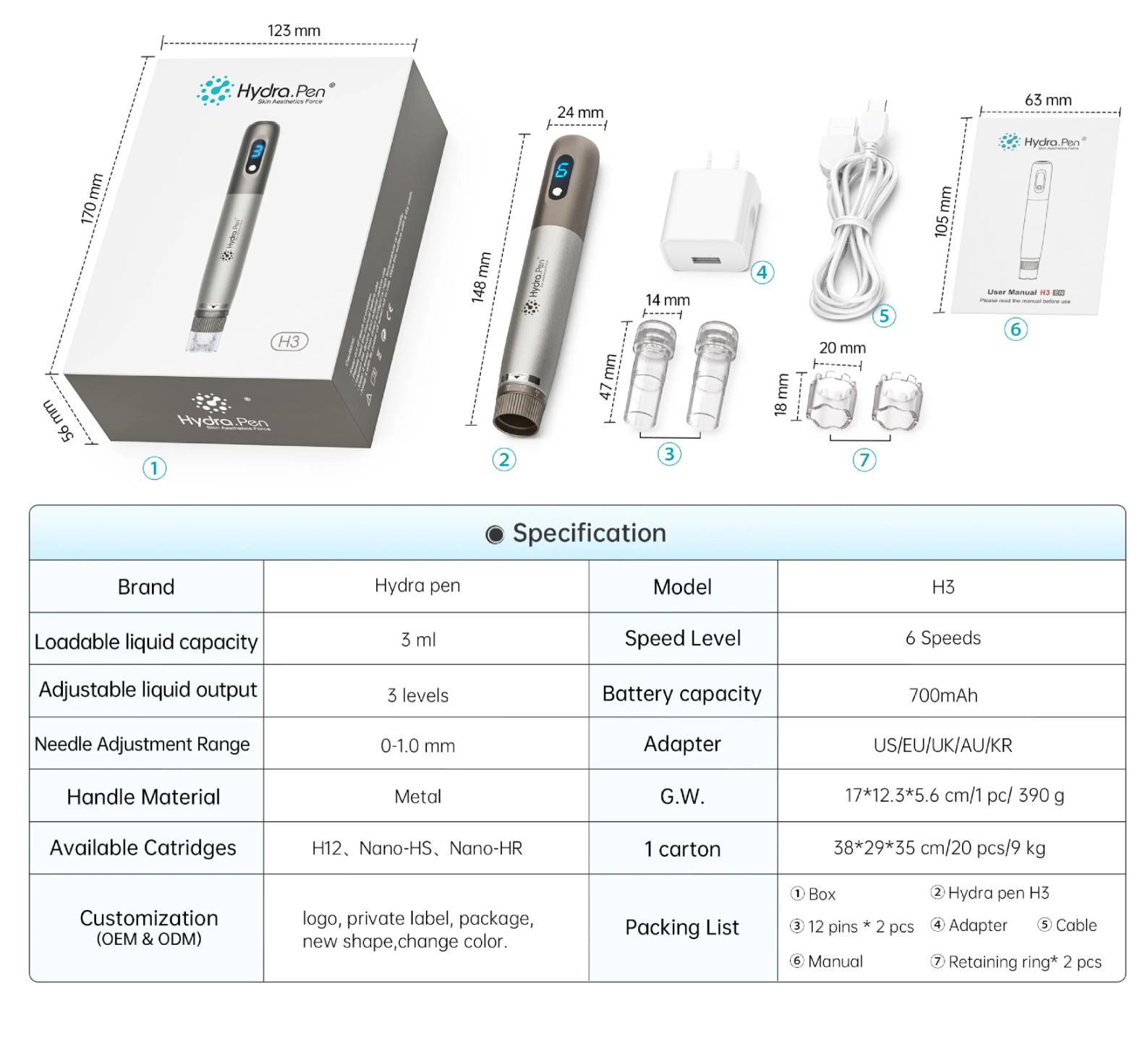 The Hydra Pen H5 has a wide range of cartridge options, including H12-pin, H24-pin, H36-pin, H-Round Nanoneedling, and H-Square Nanoneedling cartridges. These versatile options allow beauty professionals to customise treatments for various skin types and specific procedures, ensuring personalised care and optimal results.